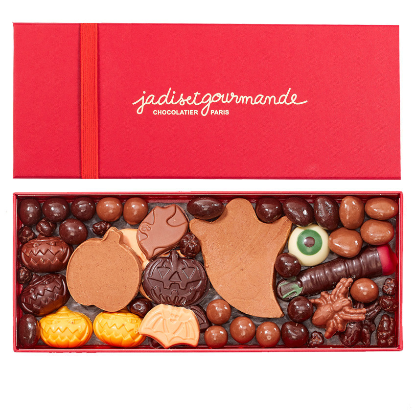 Un coffret terrifiant dans lequel vous pourrez déguster une bouchée trouille et une bouchée fantôme en praliné, des dragées chocolatées, de la friture d’ Halloween et un moulage de doigt et un œil garni de praliné.