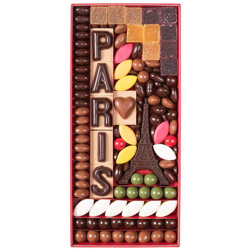 ♦ Boite garnie de dragées chocolats, de lettres en chocolat, d'une Tour Eiffel, de calissons, de pâtes de fruits