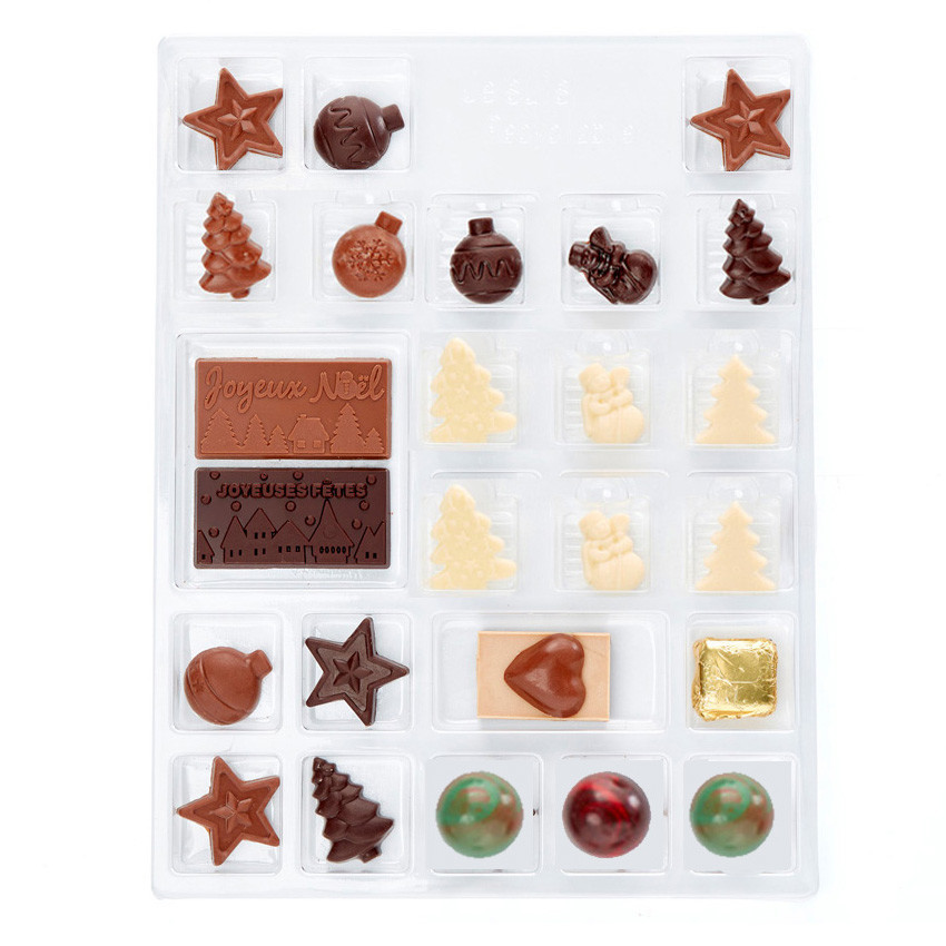 Garni d'un assortiment de chocolats : fritures de noël, des petits chocolats praliné