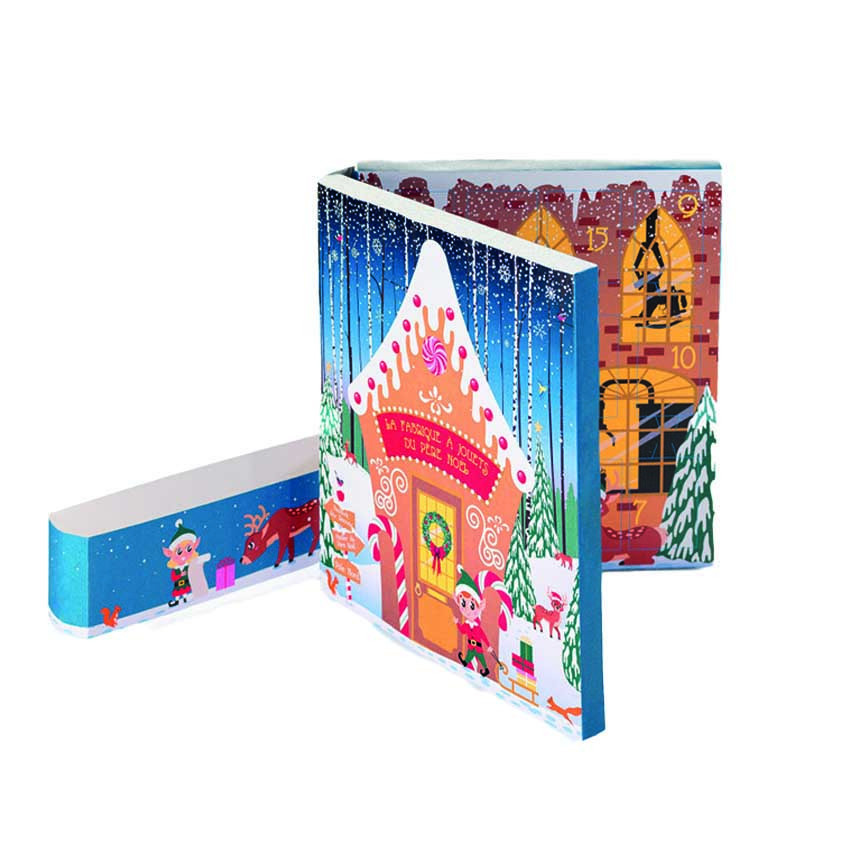 Un calendrier de l'avent qui s'ouvre comme un livre garni de bons chocolats pour régaler les enfants