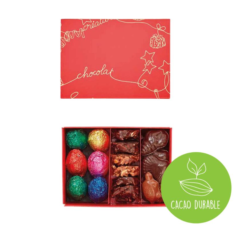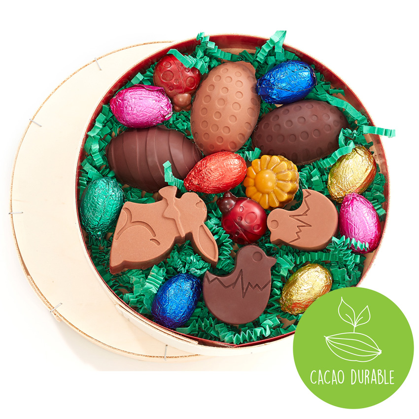 Vous pouvez par exemple marquer le coup en offrant de délicieux chocolats dans un joli coffret. Vous pouvez le cacher, il suffit de trouver le bon endroit ! Du coffret classique aux boites à œufs, en passant par les moulages traditionnels, il y en a pour tous les goûts dans nos coffrets de chocolats de Pâques. Dans nos coffrets, nous mettons en avant toutes les saveurs : chocolat noir, chocolat blanc, chocolat au lait, caramel, nougatine, praliné, noisette, fleur de sel, amande... bref, il y en a pour toutes les papilles et tous les gourmands.