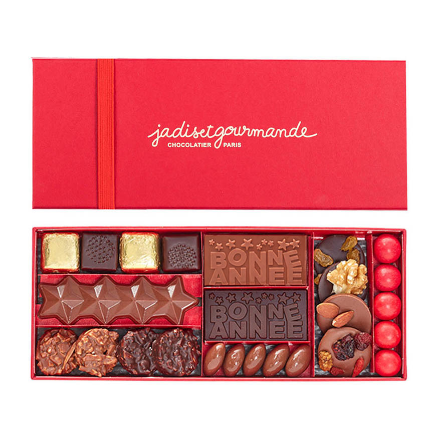 Sucre, Pâte de cacao, AMANDES, Chocolat LAIT 31% (sucre, beurre de cacao, poudre de LAIT entier, pâte de cacao, émulsifiant : lecithine de SOJA, arôme naturel de vanille), Poudre de LAIT entier, Beurre de cacao, NOISETTES, CREME, NOIX, Raisins secs, Arôme naturel de vanille, Emulsifiant : Lécithine de SOJA, Glucose, Sucre inverti, Gomme arabique, Shellac, Baie de Goji, Physalis séchés, Cranberries, Mûres, Huile de tournesol, Chocolat noir 60% de cacao (pâte de cacao, sucre, beurre de cacao, lécthine de SOJA, arôme naturel de vanille), Eau, Grain de café torréfié , Sorbate de potassium, Emulsifiant : Lécithine de SOJA, Huile alimentaire d'enrobage d'origine végétale (huile de tournesol) non hydrogénée, Vanille, Sel, LAIT, Sorbitol en poudre, Chocolat noir (Cacao : 72% minimum), SULFITES E220, Glycérine, Chocolat au LAIT (Cacao : 33 % minimum), Denrées alimentaires colorantes : Concentré de radis, citron, cassis, Amidon de riz, Cire de Carnauba, Cire d'abeille.