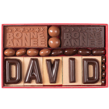 de 5 lettres en chocolat noir sur un socle praliné et gianduja à personnaliser,