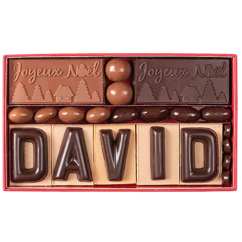 ♦ Boite de chocolat garnie de mini-plaques Joyeuses Fêtes, de lettres en chocolat et de dragées chocolatées