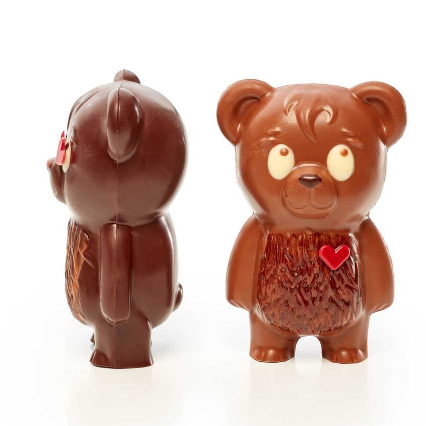 Plongez dans le monde de la gourmandise et de la douceur avec notre adorable peluche en chocolat lait 33% de cacao durable et à l'intérieur un cœur praliné.